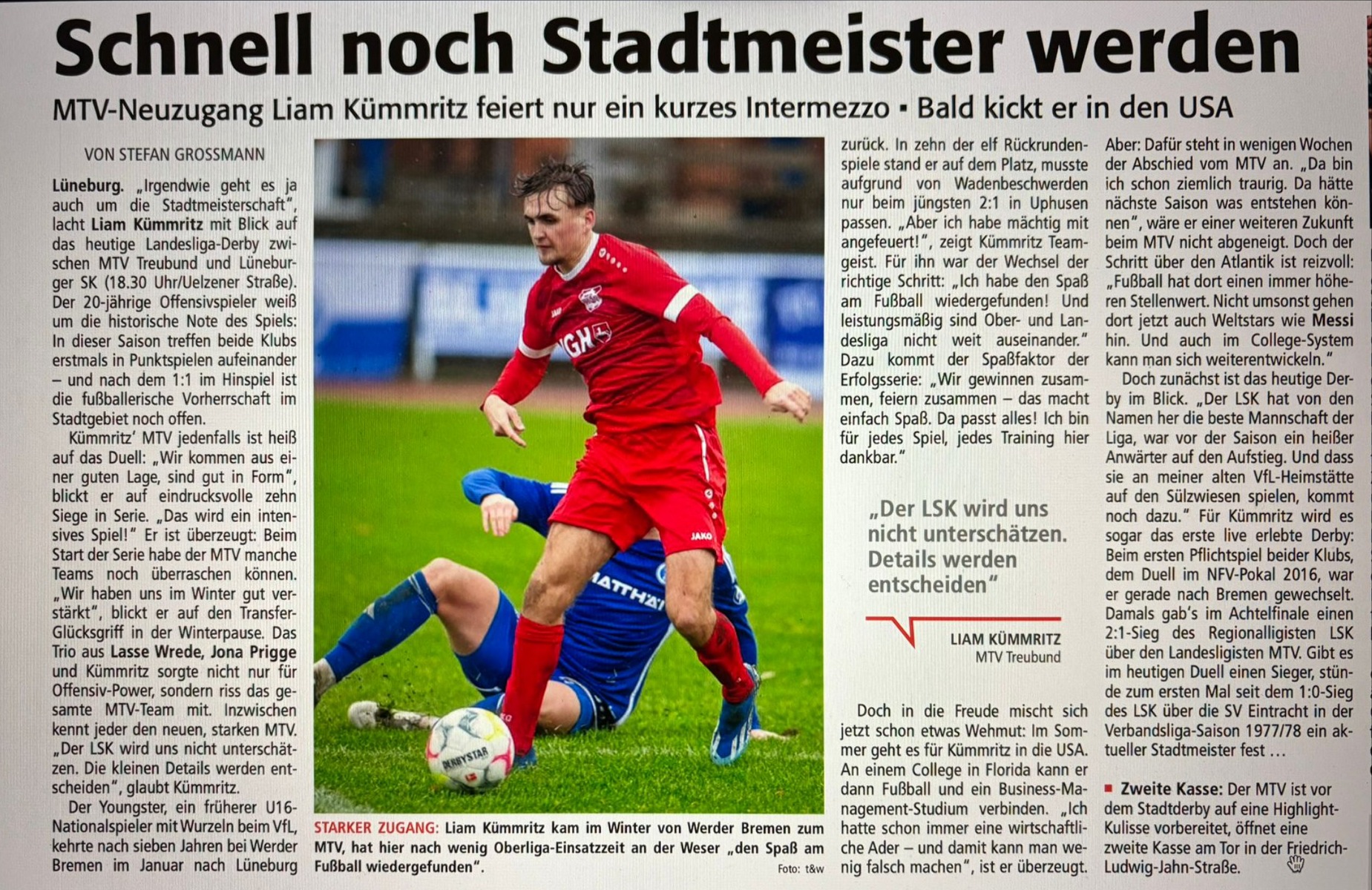 Liam Kümmritz steht mit dem MTV Treubund im Fokus des Stadtderbys gegen den Lüneburger SK und hat mit dem Team gute Chancen auf die Stadtmeisterschaft. Der 20‐jährige Winterneuzugang hat sich schnell integriert, sportlich wie menschlich überzeugt und maßgeblich zur Erfolgsserie des MTV beigetragen. Kümmritz betont den starken Teamgeist und rechnet mit einem engen Derby, bei dem Kleinigkeiten entscheiden werden. Für ihn ist die Zeit beim MTV allerdings nur ein kurzes Intermezzo, da er im Sommer in die USA wechselt, um dort Fußball und ein Studium zu verbinden.